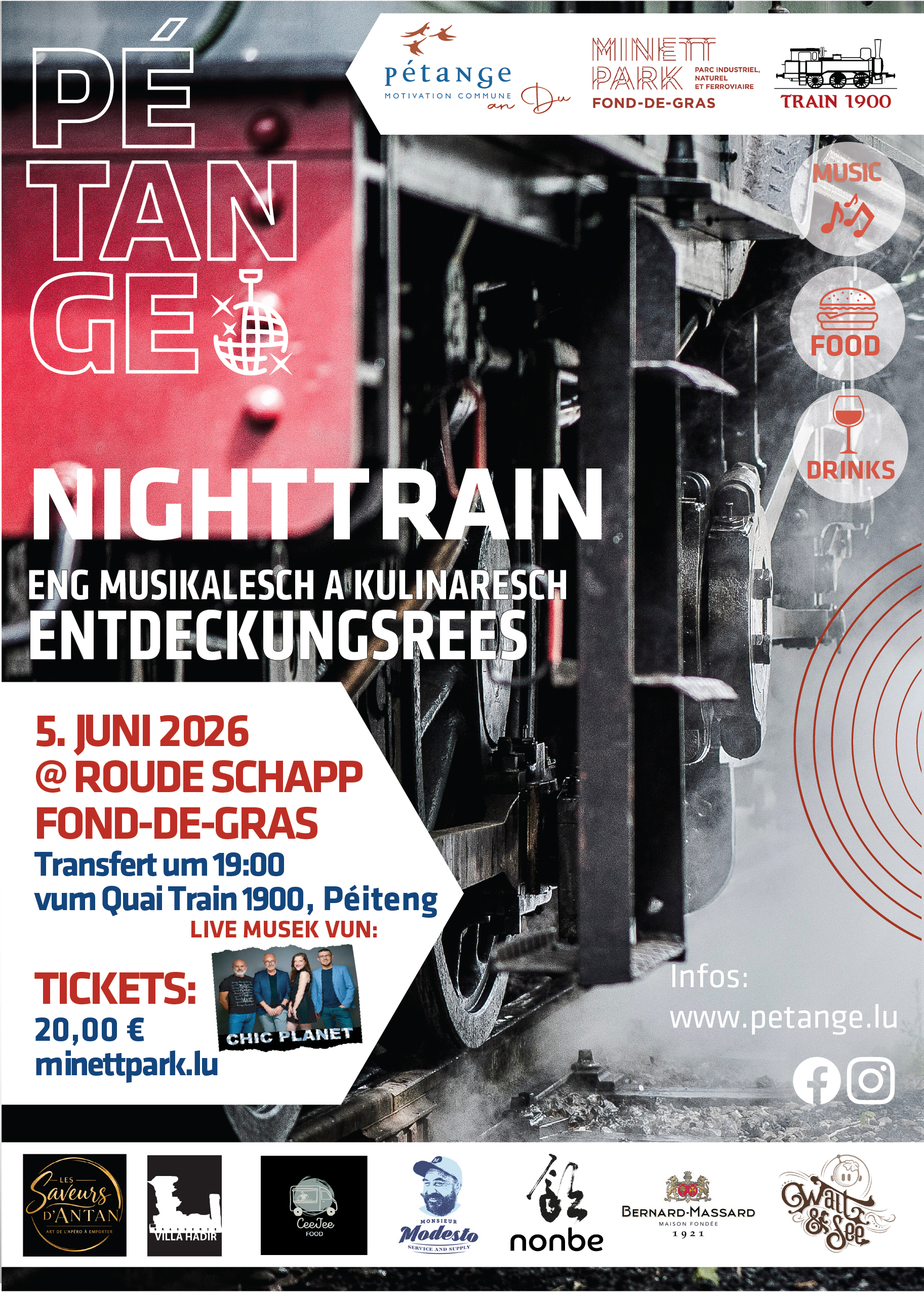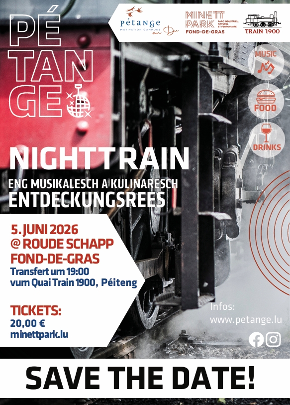 Départ : 19h00 sur le quai « Train 1900 » à Pétange (derrière la gare CFL, rue de Niederkorn). Le train est à quai à partir de 18h30